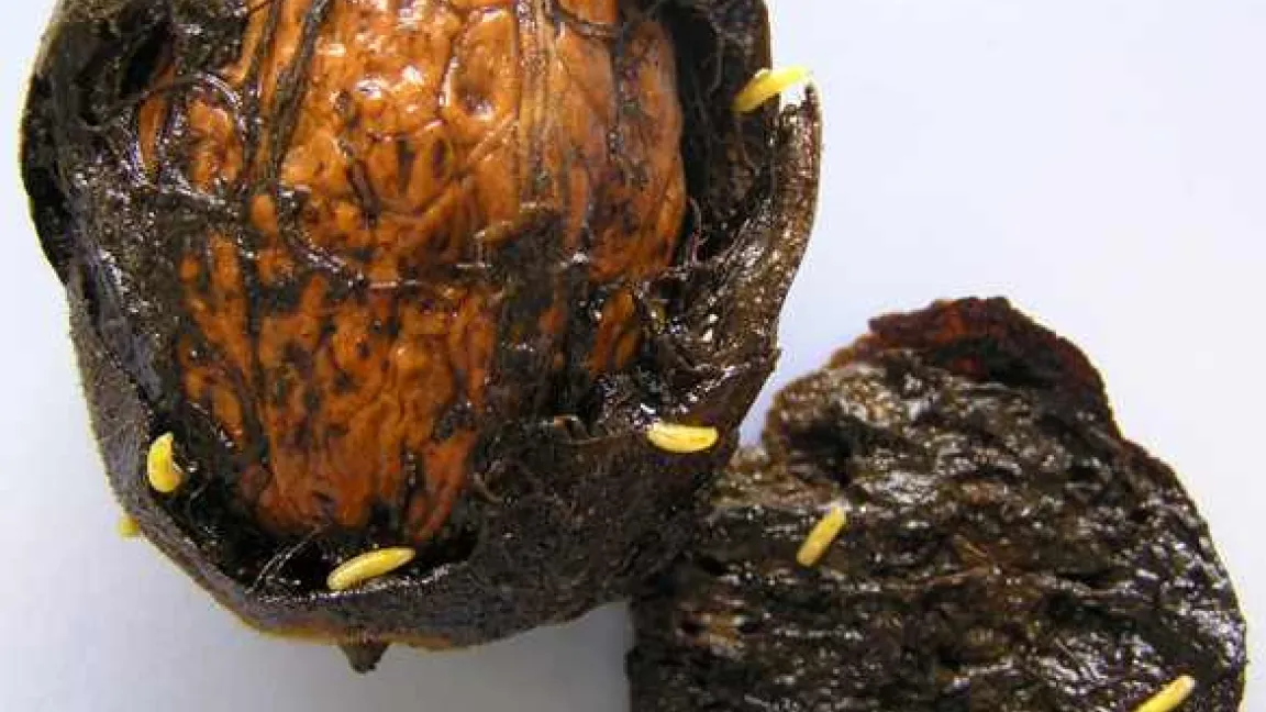 Zur Erntezeit werden die schwarz verfärbten, faulen Fruchtschalen in den Baumkronen sichtbar. Sie sind ein Hinweis auf einen Befall der Fruchtfliege, das heißt, ihrer Larven. Die Maden ernähren sich vom Fruchtfleisch, das weich, schwarz und schleimig wird und an der Nussschale klebt. Diese wird dadurch schwarz und unansehnlich. Bei starkem Befall bleibt selbst der Nusskern nicht verschont. Es kommt zu Ertrags- und Qualitätseinbußen. In Italien sind 50 bis 90 Prozent der Nüsse befallen. Nach drei bis fünf Wochen Fraßtätigkeit fallen die weißen Maden alleine oder mit den Nüssen auf den Boden, vergraben sich in der Erde und verpuppen sich. Die Fliegen, so groß wie unsere Hausfliegen mit einem gelben Rückenschild, schlüpfen etwa Ende Juni und legen bis September ihre Eier in die grünen Fruchtschalen, aus denen die Larven schlüpfen.
