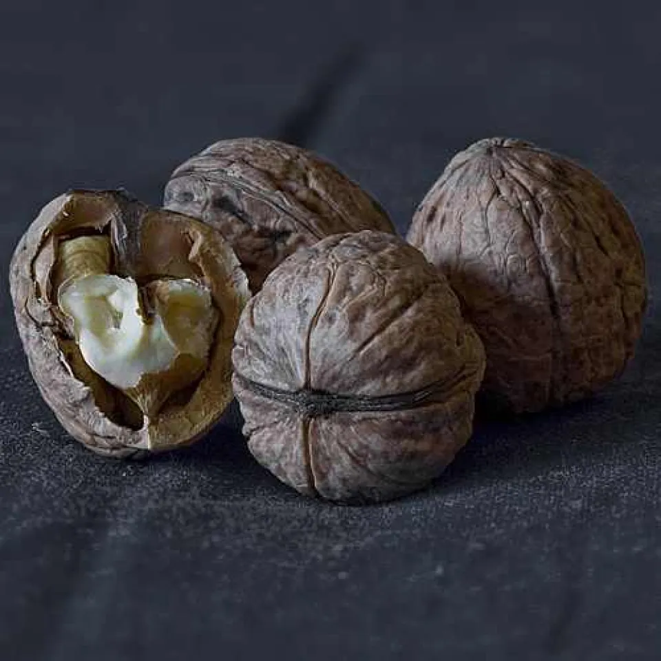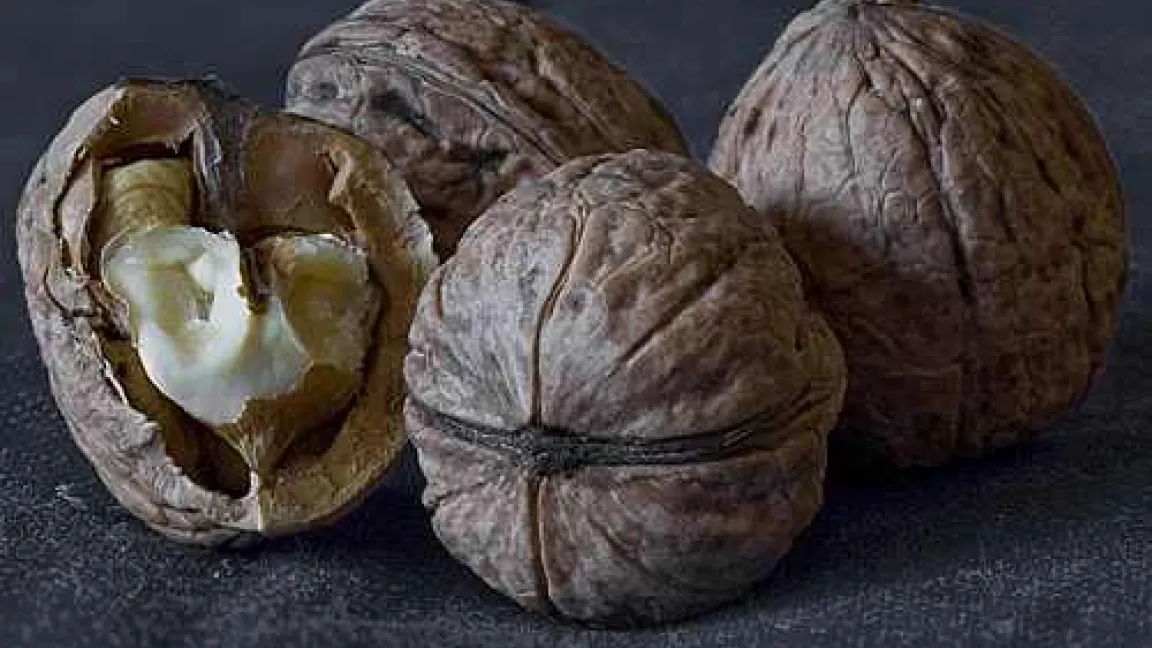 Frisch geerntet schmeckt das hellgelbe Innere der Walnüsse fast noch besser als zu Weihnachten oder später. Oft verfärbt es sich mit der Zeit leicht grau. Das lässt vermuten, dass Schimmel in die Nuss eingedrungen ist. Deshalb auf keinen Fall Nüsse verwenden, deren Schalenhälften einen kleinen Spalt aufweisen, so dass sie nicht dicht aufeinander sitzen. Hier kann sich bereits der Schimmelpilz eingenistet haben. Er bildet giftige Substanzen, die Krebs auslösen können.