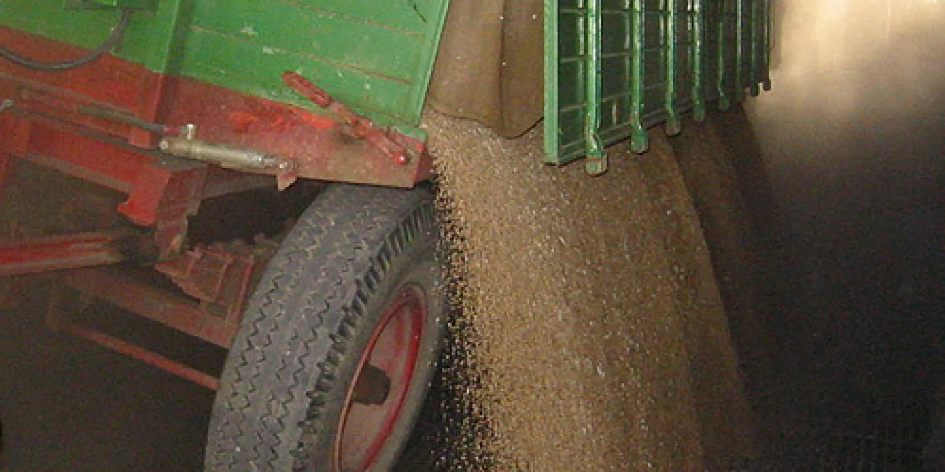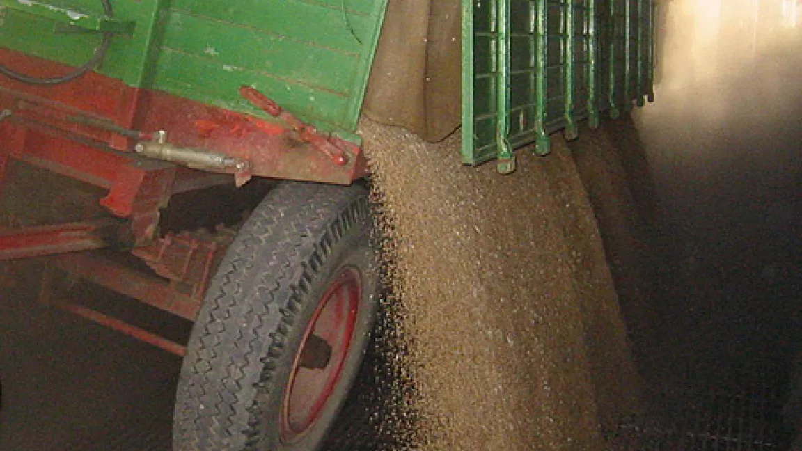 Weizenanlieferung. Die Körner gelangen durch das Gitter über einen Trichter auf eine Förderkette in die Reinigung. Staub, Stroh, Spelzen oder andere Stoffe werden entfernt. Ggfs. wird das Getreide auf unter 15 Prozent Wassergehalt getrocknet, um es lagerfähig zu machen. Parallel dazu wird die Qualität ermittelt (Hektolitergewicht, Proteingehalt, die Fallzahl als Maß für die Backfähigkeit und den Fusariumbefall. Anschließend wird der Weizen je nach Qualität zu Mehl vermahlen oder in Futtermischungen eingebracht.