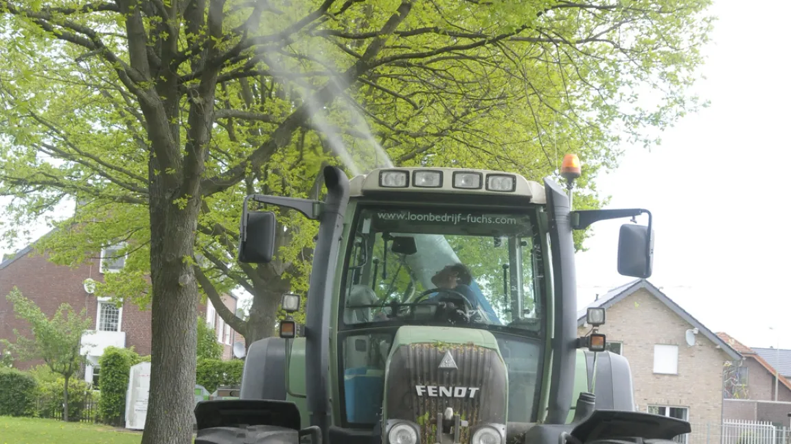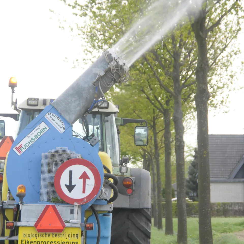 Inzwischen beteiligen sich schon zehn Gemeinden des Kreises an den Einsätzen, rund 9000 Eichen werden so in jedem Frühjahr mit dem Bazillus vorbeugend behandelt. Dazu beauftragt der Kreis das Lohnunternehmen Fuchs aus dem niederländischen Ort Born. Der Betrieb verfügt über mehrjährige Erfahrung bei der Eichenprozessionsspinner-Bekämpfung und auch über die notwendige Schlagkraft, um das kurze, etwa dreiwöchige Zeitfenster optimal nutzen zu können. Dafür stehen drei Spezialspritzen samt Personal mit Sachkundenachweis zur Verfügung. Die Spritze arbeitet elektrostatisch. Eine Turbine vernebelt das Sprühmittel, das durch Düsen am Ende des Rohres mit hohem Druck nach außen gepresst wird. Der austretende Sprühnebel wird elektrostatisch aufgeladen. So lässt sich das Haftverhalten der Tröpfchen an den Blättern verbessern.