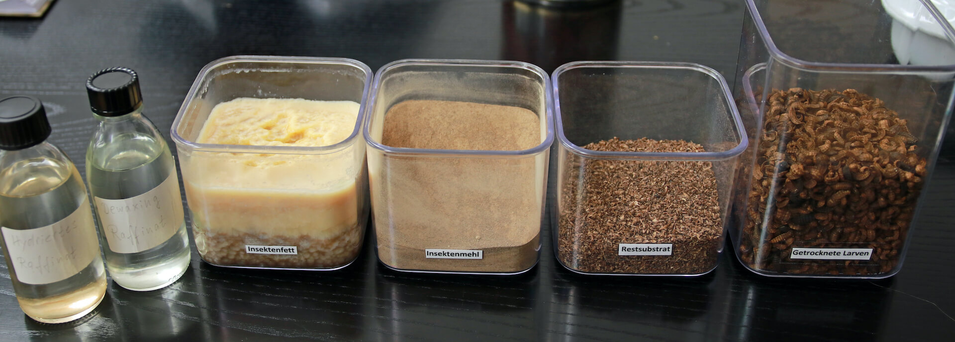 Noch ungeklärt ist auch die Frage, was die Fliegenlarven fressen dürfen. „Es ist ja eigentlich Aufgabe von Insekten im Kreislauf der Natur, Reststoffe zu beseitigen“, erklärt Katz. Doch hier gerät der Kreislauf der Natur in Konflikt mit dem Gesetz. Insekten, vor allem solche, die als Lebens- oder Futtermittel erzeugt werden, gelten als „Nutztiere“ und dürfen nur zugelassene Futtermittel erhalten: „Das ist natürlich suboptimal. Wirklich nachhaltig wird es ja erst, wenn wir Reststoffe verfüttern dürfen“. Um den Hürden der Lebens- und Futtermittelverordnungen aus dem Weg zu gehen, haben sie auch die Nutzung im technischen Bereich untersucht. Katz zeigt Fläschchen mit klaren Flüssigkeiten: „Das sind Kerosin und Diesel aus Insektenfett. Wir haben zum Beispiel die Idee, auf dem Münchener Flughafen alle Lebensmittelabfälle zur Fliegenlarvenproduktion einzusammeln und aus dem Fettanteil Diesel für die Flughafenfeuerwehr herzustellen“.