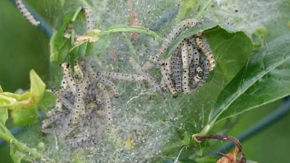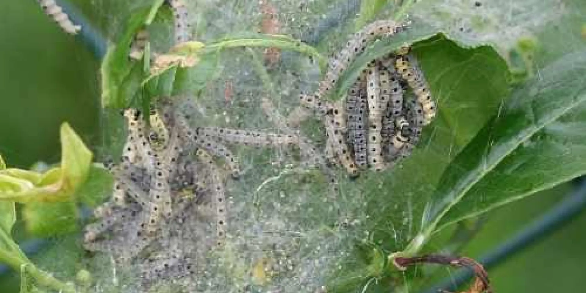 Dichte weiße Gespinste überziehen im Frühjahr insbesondere Obstbäume, Felsen- und Traubenkirsche, Schlehe, Weißdorn oder das Pfaffenhütchen. Gespinstmotten schützen damit ihre Larven.Unter den feinen Netzen laben sich 20 Millimeter lange, gelbgraue bis grüngraue Raupen mit schwarzen Flecken am Rumpf und schwarzem Kopf gut geschützt vor Feinden an den Blättern. Häufig fressen sie Bäume und Sträucher vollständig kahl. „In diesem Jahr ist der Befall regional sehr unterschiedlich“, berichtet Dr. Martin Hommes vom Julius-Kühn-Institut in Braunschweig. Die niedrigeren Temperaturen Anfang Juni haben die Gespinstmotten in ihren Fraßaktivitäten ein wenig gehemmt.