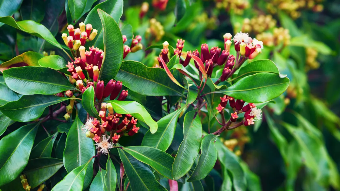 Der immergrüne Gewürznelkenbaum (Syzygium aromaticum) wird über 10 Meter hoch und stammt ursprünglich von den Molukken, den sogenannten Gewürzinseln in Indonesien. Die zur Familie der Myrtengewächsen (Myrtaceae) gehörende Pflanze hat ledrige, saftig grüne Blätter, über deren Drüsen ätherisches Öl abgegeben wird. Den höchsten Anteil an ätherischen Ölen haben allerdings die Blüten, die am Ende der Zweige in Trugdolden stehen. Diese sind aus jeweils vier Kelch- und Kronblättern aufgebaut und zunächst cremefarben. Nachdem die zahlreichen Staubblätter abgefallen sind, werden sie jedoch rot. Der unterständige Fruchtknoten wird aus zwei Fruchtblättern gebildet und besitzt neben zahlreichen Samenanlagen auch viele Drüsen, die bis zu 20 Prozent ätherisches Öl enthalten. Nach der Befruchtung entwickelt sich eine dunkelrote Beere, auch „Mutternelke“ genannt.