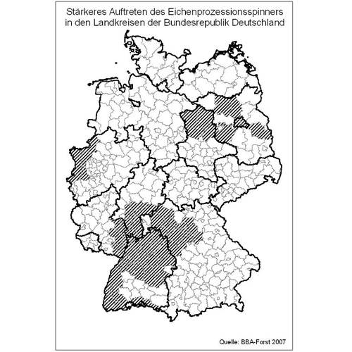 Die Biologische Bundesanstalt für Land- und Forstwirtschaft (BBA) hat in Zusammenarbeit mit den Forstlichen Versuchsanstalten der Bundesländer eine Übersicht der Regionen herausgegeben, in denen mit dem massenhaften Auftreten des Eichenprozessionsspinners zu rechnen ist. Auch 2007 hat er sich stark vermehrt Zahlreiche Spielplätze und Schwimmbäder wurden vorsichtshalber geschlossen. Die punktuelle Bekämpfung des Schädlings bleibt nach wie vor das Mittel der Wahl, um die Bevölkerung in besonders gefährdeten Gebieten vor gesundheitlichen Beeinträchtigungen zu schützen.„Der Eichenprozessionsspinner hat sich seit dem Hitzejahr 2003 ausgebreitet“ berichtet Professor Alfred Wulf, Direktor des Instituts für Pflanzenschutz im Forst an der BBA „Massenvermehrungsperioden dieses Falters sind nicht ungewöhnlich, aber seit einigen Jahren ist eine Wanderung nach Norden erkennbar“. Problematisch sind die Gifthaare der Raupen, die noch nach Jahren bei empfindlichen Personen allergische Reaktionen auslösen können. Die BBA gibt ein Faltblatt zum Eichenprozessionsspinner heraus, das gegen Rückporto beim Institut für Pflanzenschutz im Forst, Messeweg 11/12, 38104 Braunschweig, angefordert oder hier heruntergeladen werden kann.