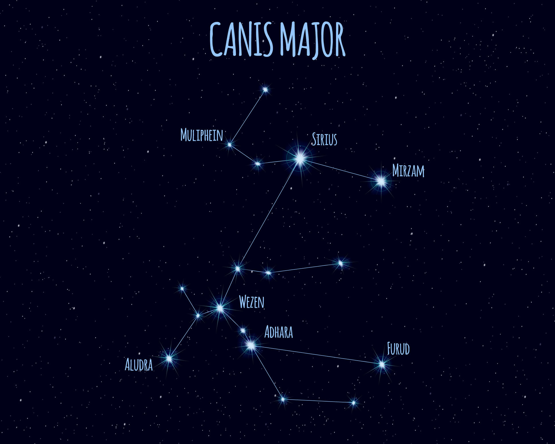 Sirius hatte bei vielen alten Kulturen eine große Bedeutung. Die alten Griechen glaubten, dass der gleißend helle Sirius die Kraft der Sonne verstärkt und das Land während der heißen Tage versengt und ausdörrt. Für die Ägypter zur Zeit der Pharaonen kündigte Sirius dagegen die jedes Jahr wiederkehrende Nilschwemme an, die für die Fruchtbarkeit der Landwirtschaft sehr bedeutend war, und war damit positiv besetzt. Muliphein und Aludra sind weitere Sterne im Sternbild Großer Hund. Vom Aufgang bis zur Sichtbarkeit des gesamten Sternbilds vergehen 30 bis 31 Tage.