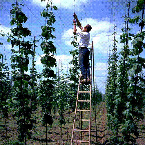 Hopfen will jeden Tag seinen Herrn sehen, sagt ein altes Sprichwort. Während Wildhopfen fast überall in Mitteleuropa in Auwäldern, Waldrändern und Gebüschen wächst, gedeiht der Kulturhopfen nur an sonnigen Standorten auf wasserdurchlässigen, nährstoffreichen Böden. An jedem Hopfenstock wachsen im Frühjahr bis zu 60 Triebe, von denen nur drei an den Aufleitdrähten der sieben Meter hohen Hopfengerüste „angeleitet“, das heißt im Uhrzeigersinn um dem Draht gewickelt werden. Sind die Sprosse einen Meter hoch gewachsen, werden die Blätter entfernt, um den Befall mit Krankheiten und Schädlingen, die sich im Boden befinden, vorzubeugen. Auch die sich ständig neu bildenden weiteren Sprosse, die so genannten „Nachschosser“, müssen immer wieder entfernt werden. Sie kosten die Pflanze Kraft und dienen Schädlingen als Nistplatz.