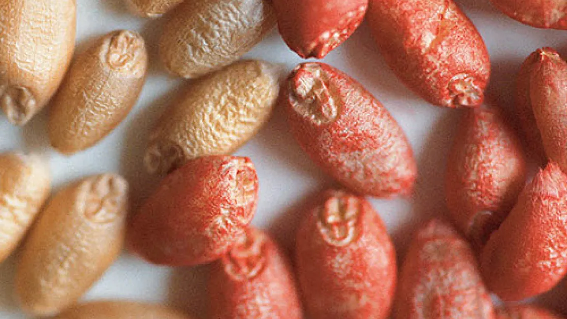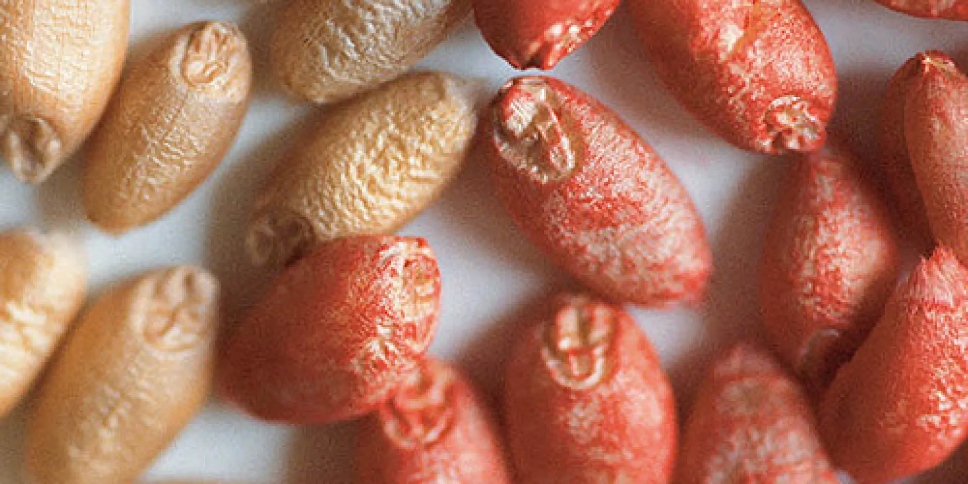 Weizenkörner: links ungebeizt, rechts gebeizt.