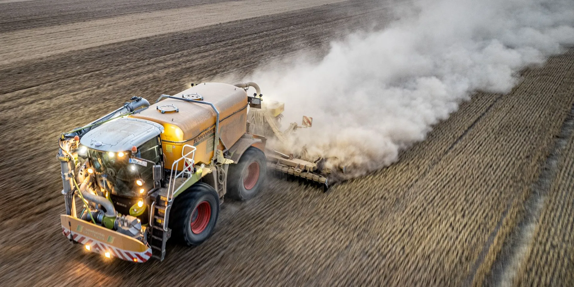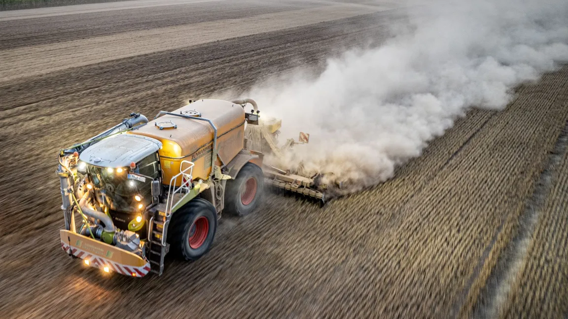 In trocken-heißen Sommern ist Staub ein gewohntes Bild auf den Äckern – hier bei der Einarbeitung von Gülle in den Boden. Foto: Matthias Wiedenau