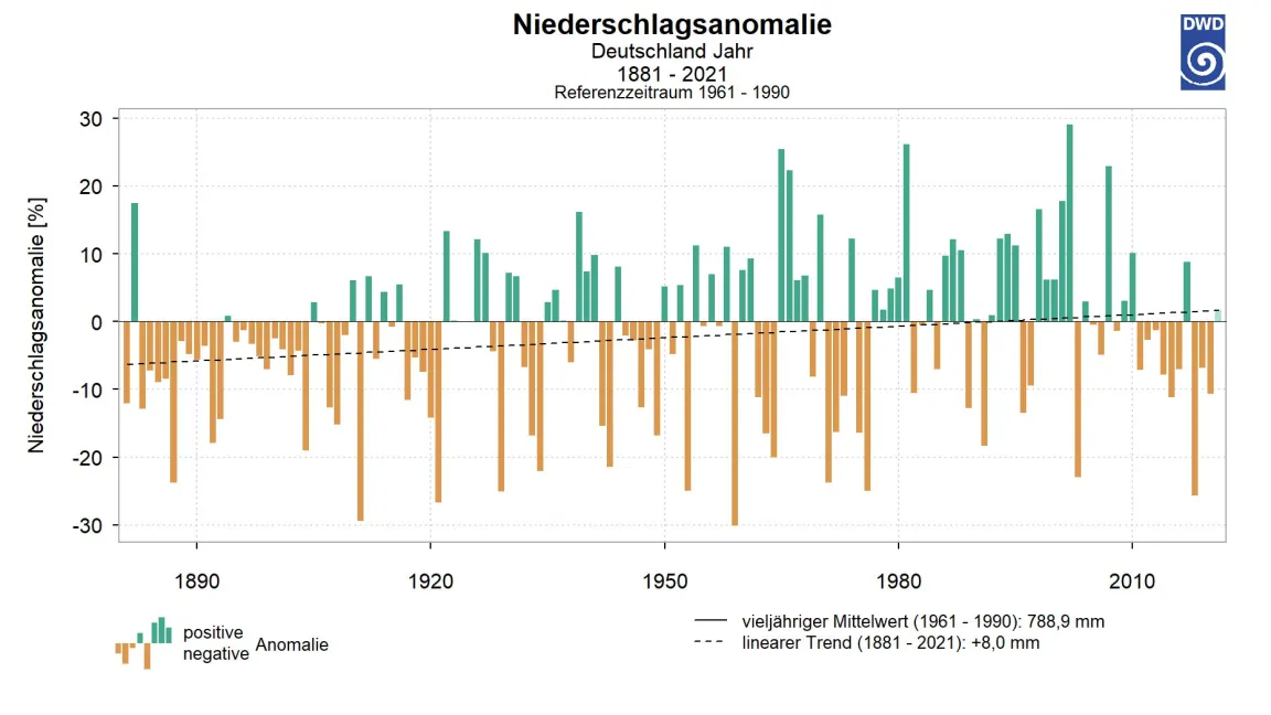 2018, 2019, 2020 und 2022 waren von teils extremer Sommertrockenheit und 2021 von Starkregenereignissen geprägt. Das ist kein Zufall und passt in die bereits seit vielen Jahren bekannten Prognosen der Klimaforscher. Demnach erwarten uns zukünftig häufiger mildere und feuchtere Winter sowie heißere Sommer mit längeren Trockenphasen und gelegentlichen Starkregenereignissen.