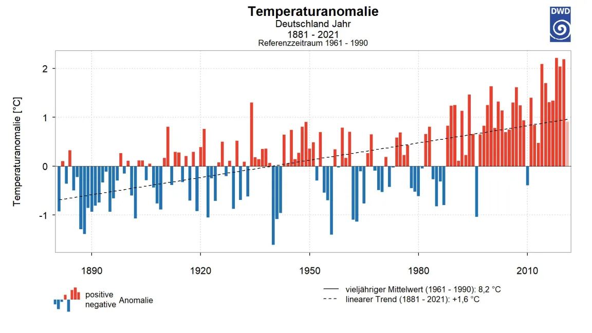 Laut Statistik des Deutschen Wetterdienstes ist die mittlere Temperatur in Deutschland seit 1881 um 1,6 Grad Celsius angestiegen. Besonders in den letzten Jahrzehnten nimmt die Erwärmung Fahrt auf. So hat sich beispielsweise die Zahl der heißen Tage mit über 30 Grad Celsius seit den 1950er Jahren von drei auf neun verdreifacht und die Eistage mit Tageshöchsttemperaturen unter 0 Grad Celsius von 28 auf 19 Tage verringert. Die durchschnittlichen Niederschläge pro Jahr weisen eine leicht steigende Tendenz auf, wobei der Anteil der Winterniederschläge zunimmt.