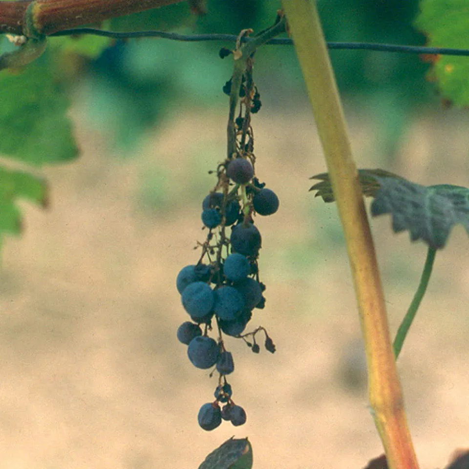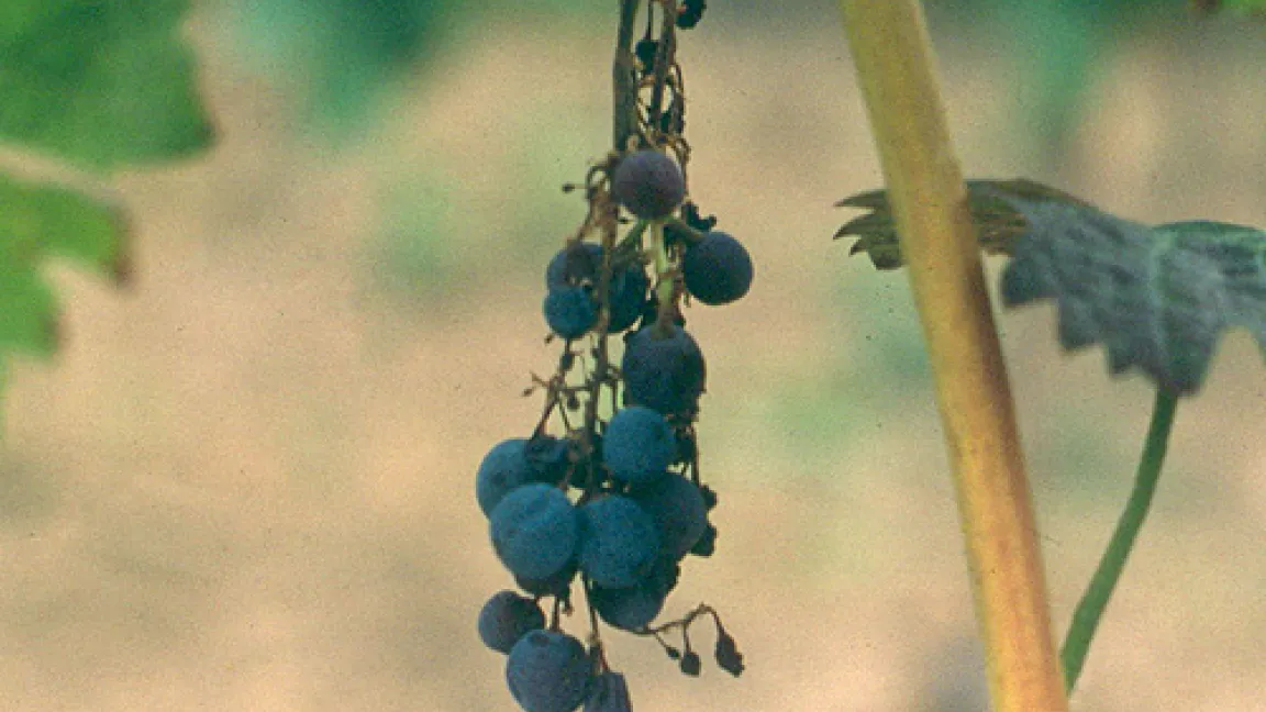 Die Folge der Schwarzholzkrankheit: Geschrumpfte Trauben.