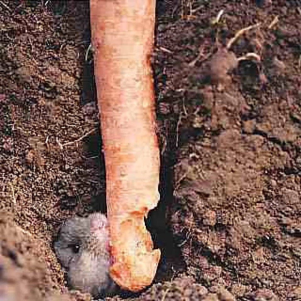 Schermaus frisst an einer Mohrrübe.