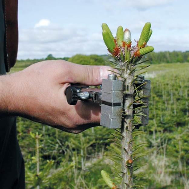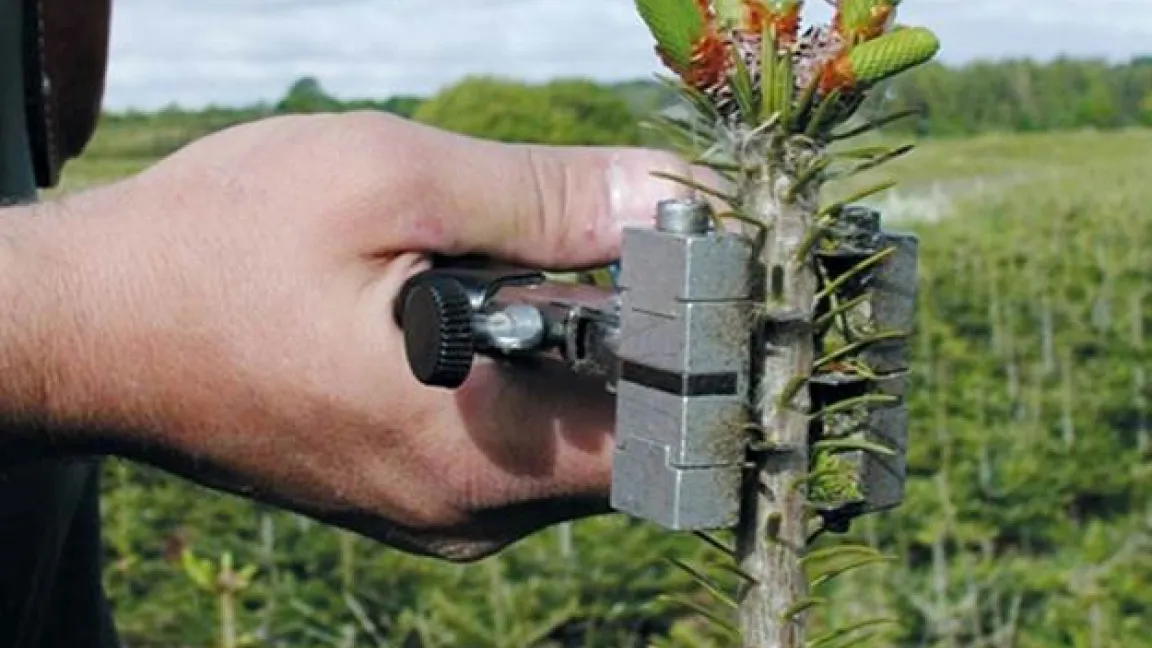 Damit die Bäume den Kundengeschmack treffen, sollen die Spitzen nicht zu schnell wachsen und die Astreihen nicht zu weit auseinander stehen. Das erreichen die Anbauer mit Hilfe einer sogenannten Top-Stopp- Zange. Dieses Spezialwerkzeug wird oben am Stämmchen angesetzt. Es drückt einige der Leitungsbahnen ein wenig zusammen, dadurch verlangsamt sich der Saftstrom. Die Bäume wachsen langsamer und formschöner. Damit die Bäume eine regelmäßige Rundung aufweisen und insgesamt schmaler wachsen, werden die äußeren Triebe von Hand herausgezwickt. Dadurch verlängert sich die Anbauzeit allerdings um ein ganzes Jahr.
