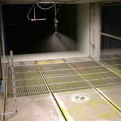 Damit die Spritzbrühe möglichst vollständig auf die Zielfläche gelangt, darf die Spritzbrühe nicht durch Luftbewegung auf Nichtzielflächen verfrachtet werden. Voraussetzung dafür, dass dies klappt, sind Versuche im Windkanal. Dort, wo sonst Automodelle oder Sportgeräte auf ihre Aerodynamik getestet werden, geht es dann um die Fragen: Wie wirken sich Windgeschwindigkeit, Düsentyp, Wassermenge und die Formulierung des Pflanzenschutzmittels auf mögliche Verwehungsverluste aus? Zu diesem Zweck wird im vorderen Teil des Kanals ein Spritzgestänge montiert. Ein Gebläse erzeugt eine Windgeschwindigkeit von bis zu 5 Metern je Sekunde. Hinter den Düsen befinden sich in Windrichtung Kollektoren und Sensoren, mit denen die Abdriftmenge ermittelt wird.