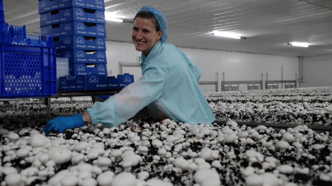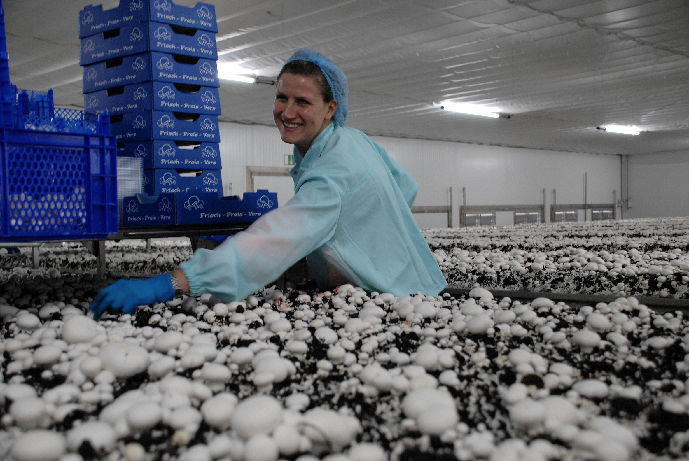 Insgesamt etwa drei Wochen dauert die Ernte von Hand. Sie steht am Ende des bis ins letzte Detail perfektionierten Produktionsprozesses. Dabei ist viel Fingerspitzengefühl nötig, denn die Pilze sollten keinerlei Druckstellen aufweisen. In drei Erntewellen holen die Pflücker bis zu 30 Kilogramm Pilze je Quadratmeter ein.