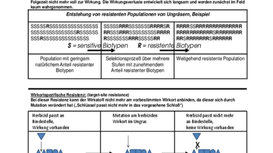 Wo ist die Ursache zu suchen? Ausgangspunkt sind zufällige Veränderungen im Erbgut der Schaderreger, sogenannte Mutationen. Dieser natürliche Vorgang kann, wenn er an der richtigen Stelle geschieht, zu einer Resistenz führen. Zwei verschiedene Ausprägungen werden unterschieden: Bei der Zielort (Taget site)-Resistenz verursacht eine zufällige Mutation an einer Stelle im Erbgut des Schaderregers von jetzt auf gleich die Unempfindlichkeit. Im übertragenen Sinn passt der Schlüssel nicht mehr ins Schloss. Auch noch so große Aufwandmengen des Wirkstoffs sind dann nutzlos. Die qualitative (metabolische) Resistenz beruht hingegen auf Anpassungsprozesse im Schaderreger. Dieser baut den gegen ihn verwendeten Wirkstoff immer schneller ab, er entgiftet sich also selbst. Zunächst helfen noch höhere Aufwandmengen, später funktioniert diese Strategie nicht mehr.