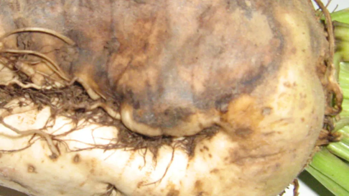 Die Schäden treten erst spät zutage: Scheinbar gesunde Rüben fallen einfach um, wenn der Landwirt beim Kontrollgang auf dem Acker mit dem Fuß gegen sie stößt. In diesem Stadium sind oberirdisch noch grüne Blätter und ein scheinbar kräftiger Rübenkopf sichtbar. Unterirdisch ist dann der Rübenkörper schon völlig verfault. Ursache ist der Fäulepilz Rhizoctonia solani, der praktisch überall im Boden vorkommt. Er dringt nahe der Bodenoberfläche an den Seiten der Rübe ein; die graubraunen Faulstellen liegen unsichtbar unter der Erde. Die Fäule wandert dann nach unten bis zur Wurzelspitze. Die Blätter sterben zuletzt. Wenn sie sich sternförmig um den Rübenkörper legen, hat die Pflanze kapituliert.