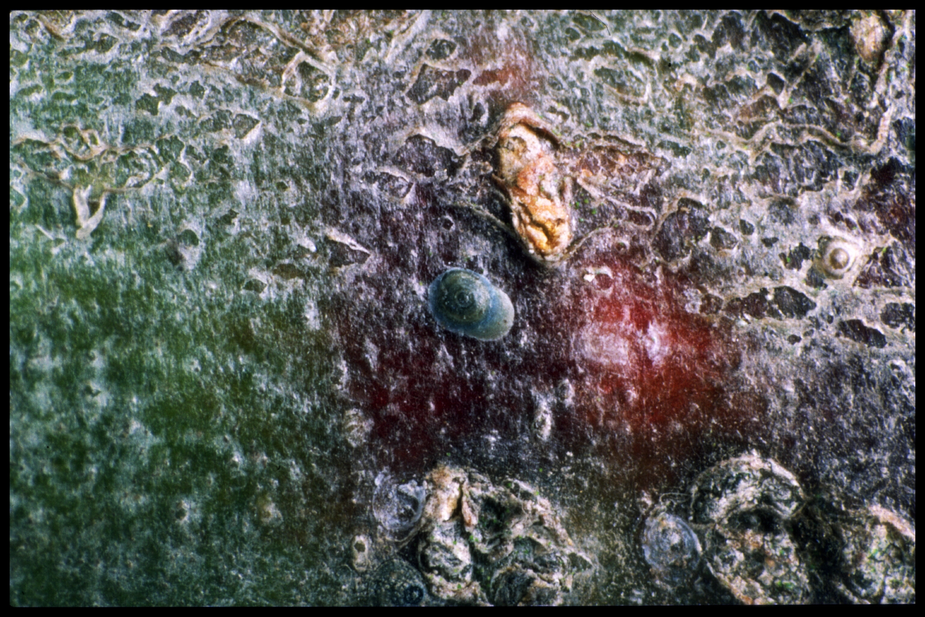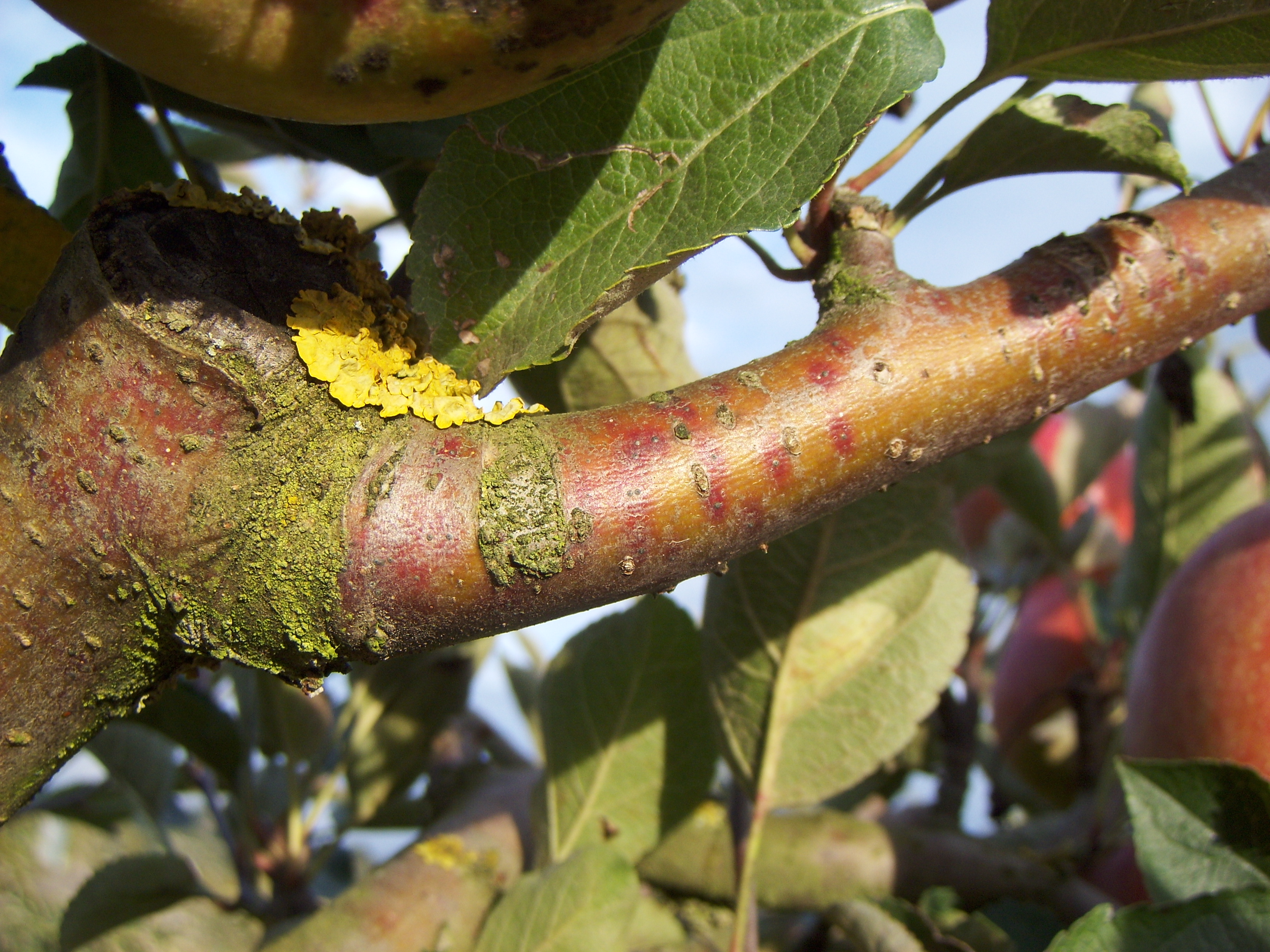 Von Juni bis Oktober sieht man auch helle Pünktchen auf den Pflanzen, das sind die kleinen, gelben, frei beweglichen Wanderlarven. Sie befallen auch Blätter und Früchte und dort mit Vorliebe die Kelch- und Stielgrube. Um die festgesaugte Schildlaus entsteht ein roter Hof, die Früchte sind nicht mehr zu vermarkten.