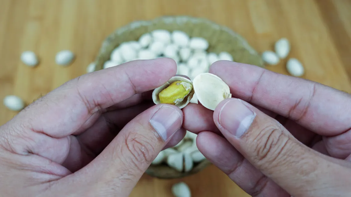 Wenn die Kerne herangereift sind, springt die harte, beigefarbene Schale auf. Diese ist am Baum allerdings noch von einer anfangs geschlossenen, 2 bis 3 Millimeter dicken Schicht Fruchtfleisch umgeben. Färbt sich dieses rötlich, ist das ein Zeichen dafür, dass es sich leicht von der Schale lösen lässt. Dann können die Pistazien geerntet werden.