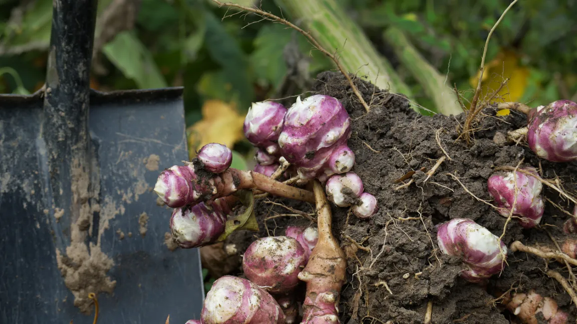 Sobald sich das Kraut braun färbt, können die Knollen ab Oktober bis in den Winter hinein geerntet werden, solange der Boden nicht gefroren ist. Pro Pflanze kann man mit acht bis zehn Tochterknollen rechnen. Im Vergleich zur Kartoffel ist Topinambur allerdings nicht so lange lagerfähig, deswegen empfiehlt sich tatsächlich die Ernte „just in time“. Es gibt auch Gartenbesitzer, die gar nicht an den Knollen für die menschliche Ernährung interessiert sind, sondern den Topinambur einfach nur als leuchtend gelb blühende Bienennährpflanze und als Sichtschutz entlang der Grundstücksgrenze anbauen.