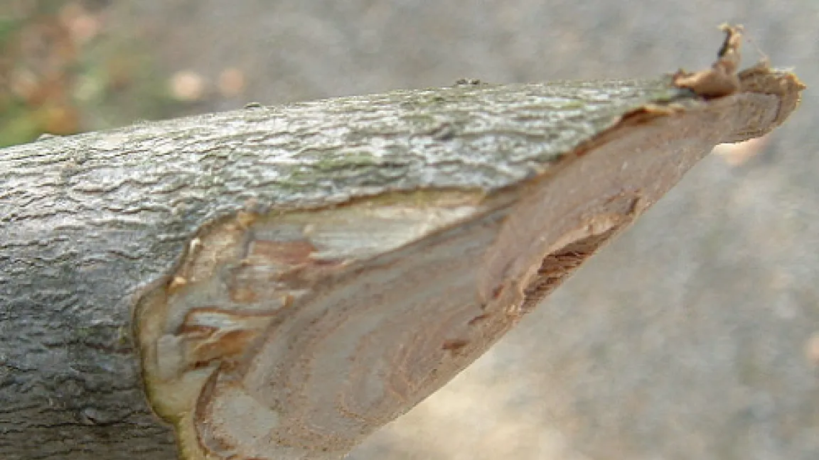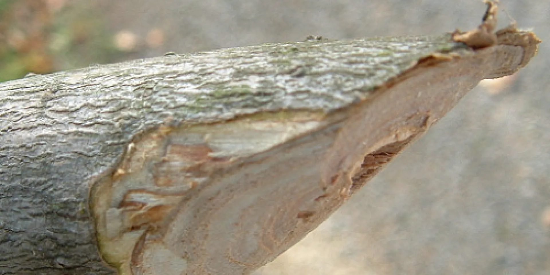 Verfärbungen im Bereich der Gefäße eines Ulmen-Asts durch den Welkepilz. Quelle: Prof. Dr. Hartmut Balder