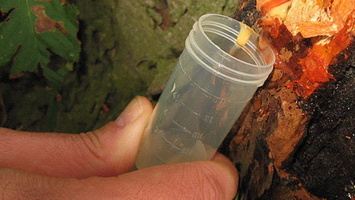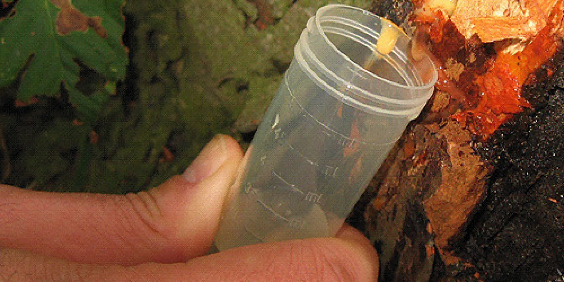 Entnahme von Bakterienschleim einer blutenden Kastanie zur weiteren Untersuchung.