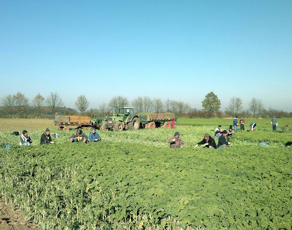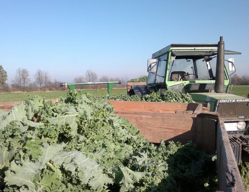 Herbst- und Winterzeit ist Grünkohlzeit. Die Ernte beginnt im Oktober und reicht bis in den Winter hinein. Grünkohl für die Frischvermarktung wird von Hand geerntet. So können die krausen Blätter sauber von den festen und wenig schmackhaften Rippen getrennt werden. Entgegen der landläufigen Meinung braucht „moderner“ Grünkohl keinen Frost, um gut zu schmecken. Denn die neuen Sorten enthalten kaum noch Bitterstoffe und mehr Zucker. Der süße Geschmack wird zusätzlich durch kühle Temperaturen verstärkt, weil diese den Zuckerabbau in den Blättern hemmen. Das Gemüse braucht besonders im Sommer reichlich Wasser, damit es üppig wächst. Zur Ernte wünschen sich die Anbauer trockene Witterung, damit der Kohl seine Qualität behält und länger lagerfähig bleibt.
