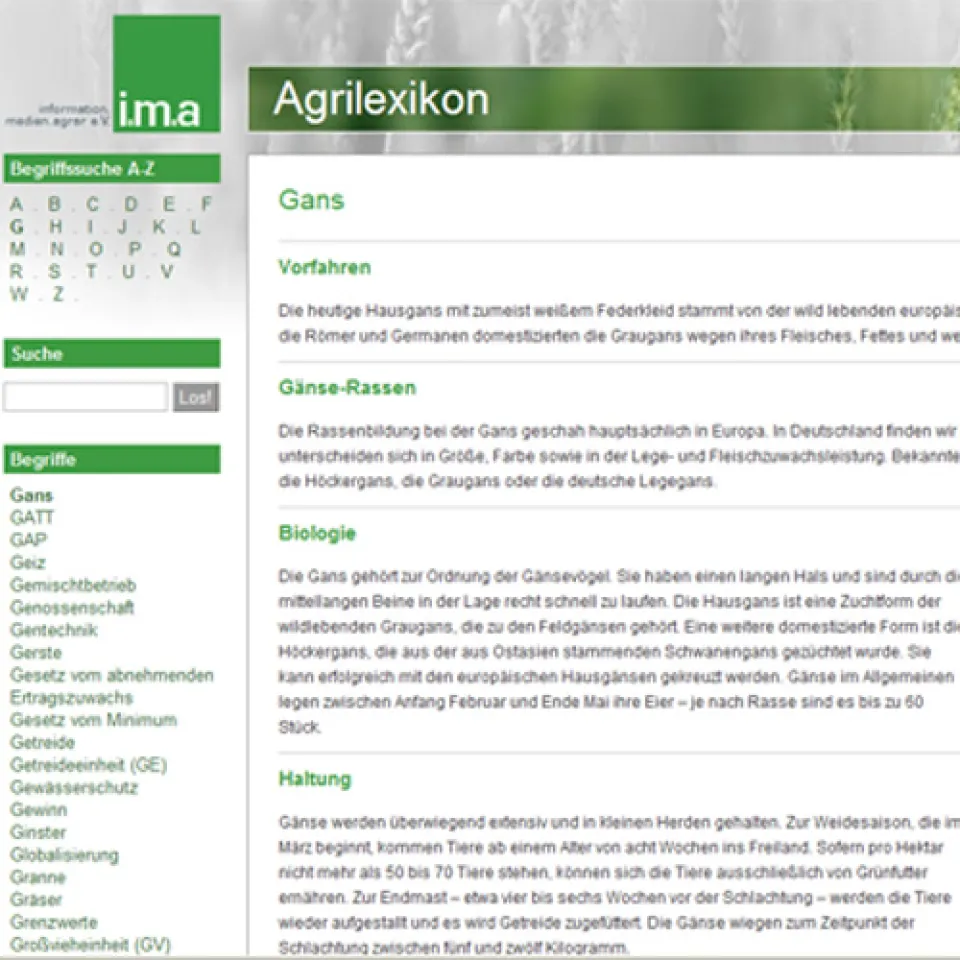 Mit über 300 Begriffen zum Thema Landwirtschaft ging das - Online-Agrilexikon des Vereins information.medien.agrar e.V. Bonn (i.m.a) im September an den Start. Von A wie Abkommen von Lomé bis Z wie Zwischenfrucht können Interessierte unter www.agrilexikon.de nach Informationen suchen. Den Grundstock lieferte das „Agrilexikon für Landwirtschaft im Unterricht“, das nach 25 Jahren durch das Onlinemedium abgelöst wird. Ziel ist, für alle Interessierten umfangreiches Basiswissen über moderne Landwirtschaft zugänglich zu machen.Besucher finden in Text und Bild zum Beispiel unter dem Sachbegriff „Kartoffel“ die wichtigsten Fakten zu dieser bedeutenden Kulturpflanze: biologische, historische, produktionstechnische und marktwirtschaftliche. Auch über Pflanzenschutz und Pflanzenschutzmittel kann man sich informieren. Ergänzende Verlinkungen verweisen auf weitere Informationsquellen, Broschüren oder Unterrichtshilfen, die auch bestellt werden können. Grafiken – überwiegend aus dem Situationsbericht der Deutschen Landwirtschaft – dürfen heruntergeladen werden, zum Beispiel für den Einsatz im Unterricht. Im Gegensatz zur 2001 gegründeten Wikipedia-Enzyklopädie, handelt es sich beim Online-Agrilexikon nicht um eine „freie“ Datenbank: Die Inhalte aus der Agrar-Welt können ausschließlich von der i.m.a autorisierte Experten einstellen.
