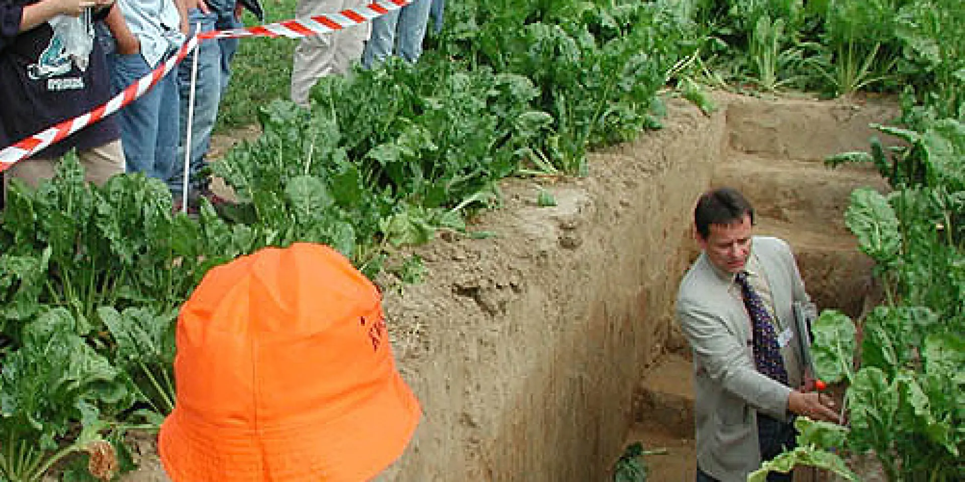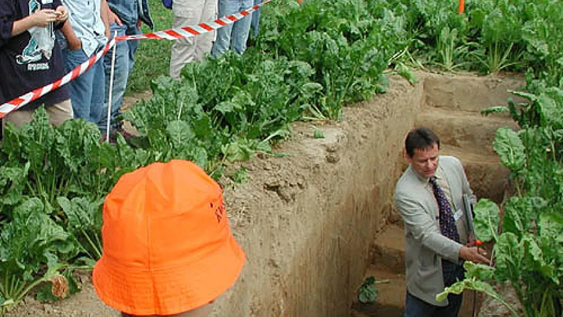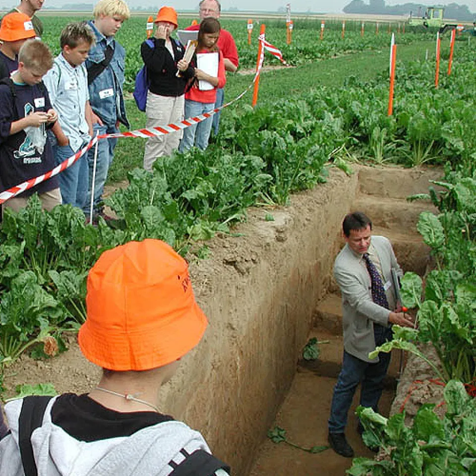 Einer Schulklasse werden die Bodenschichten gezeigt, die von den Rüben durchwurzelt werden.