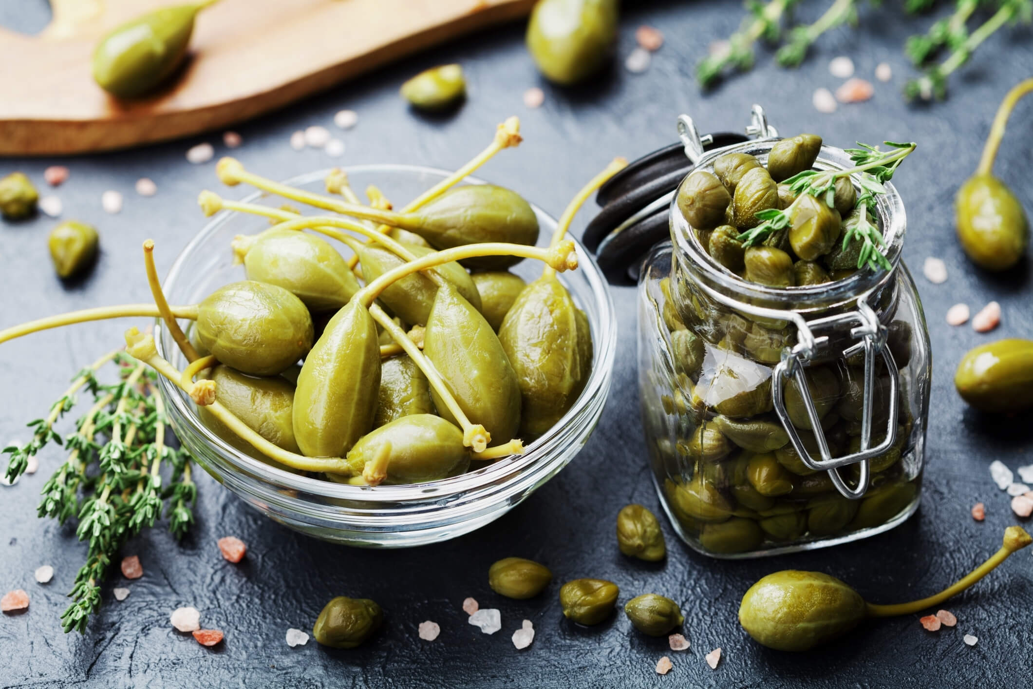 Kapern? Die gehören doch zu Königsberger Klopsen. Aber sonst? Wir kennen zumeist die in Essig eingelegten Kapern in kleinen Gläschen im Supermarktregal. Im mediterranen Raum werden diese dagegen oft nur mit Salz konserviert. Doch was sind Kapern eigentlich? Gemüse, Samen oder Früchte? Weder noch, möchte man sagen. Genau genommen sind es die unreifen, geschlossenen und fermentierten Blütenknospen, die in unserer Küche Einzug gefunden haben.Der Echte oder Dornige Kapernstrauch (Capparis spinosa) ist ein dorniger Halbstrauch. Er wird bis zu 1 Meter hoch und kann sich bis zu 3 Meter in der Fläche ausbreiten. Der Echte Kapernstrauch ist der bekannteste der rund zehn verschiedenen Kapernsträucher im Mittelmeerraum. Die wilden Kapernsträucher sind äußerst genügsam und wachsen sogar auf kargem, sonst unfruchtbarem Boden, Felsen und dem Gemäuer von alten Ruinen. Nicht umsonst sagen die Italiener, dass sich der Kapernstrauch „von Wind und Sonne ernährt“. Für unsere eingelegten Kapern werden aber zunehmend nicht mehr wilde Kapernsträucher beerntet, wie es zum Beispiel in Marokko heute noch üblich ist, sondern dornenlose Sträucher in Plantagen kultiviert. Südfrankreich und Süditalien zählen neben der Türkei, Griechenland und Spanien zu den Hauptanbauländern.