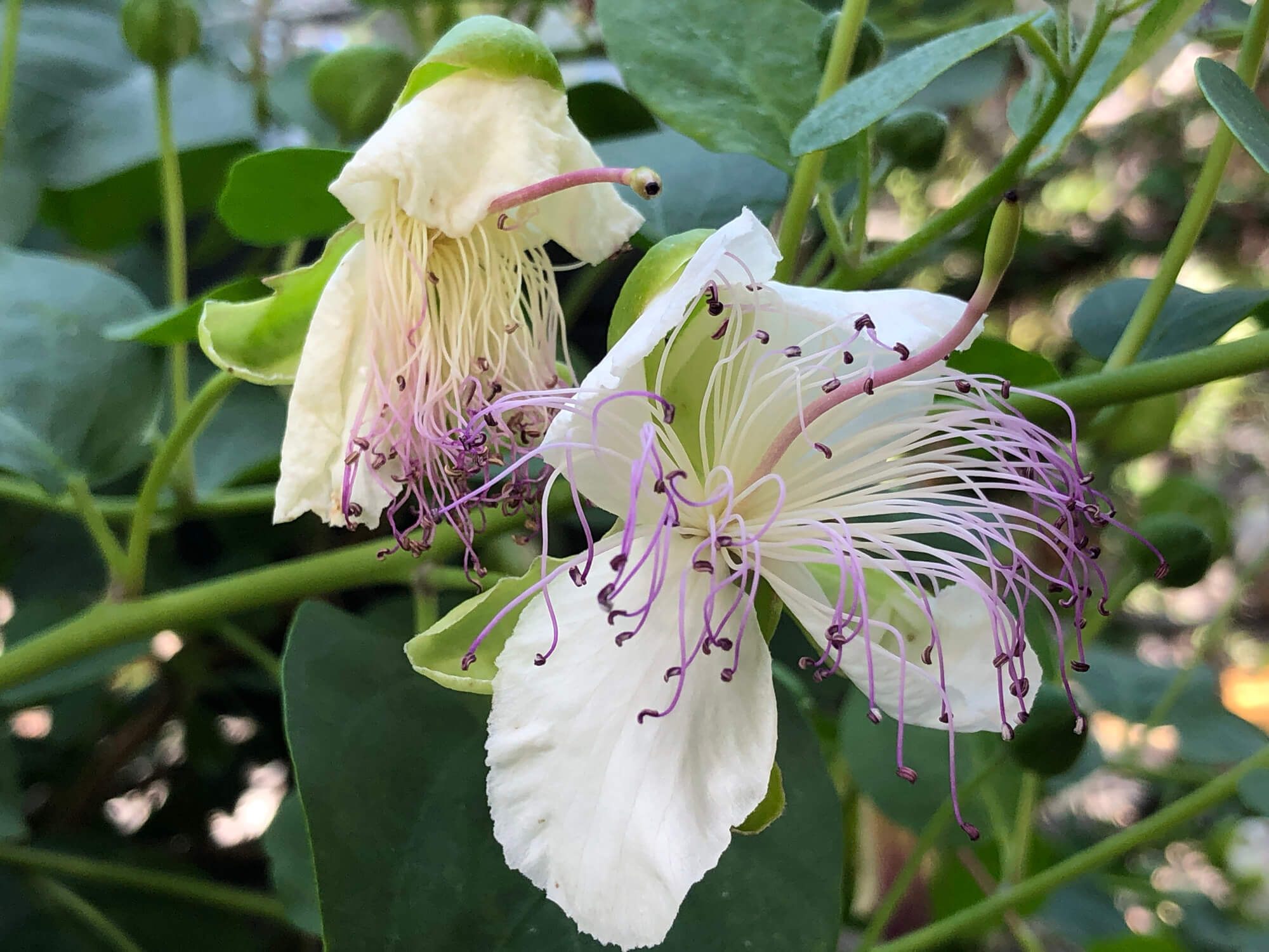 Wer gerne Kapern isst, kann auch hier einen Kapernstrauch anpflanzen. An einem warmen, sonnigen und trockenen Platz im Wintergarten, auf dem Balkon oder der Terrasse lässt er sich auf jeden Fall kultivieren. Als mediterrane Pflanze verträgt der Kapernstrauch keinen langanhaltenden Frost, kann aber kurzzeitig bis zu minus 5 Grad Celsius vertragen. Optimal ist eine Überwinterung bei 8 Grad Celsius. In milden Regionen eignet er sich auch als Bodenbedecker oder zum Bepflanzen von sonnigen Trockenmauern. Dort macht er sich sehr dekorativ, denn ab etwa 20 Zentimeter Länge biegen sich die Äste nach unten. Die Blütenknospen wachsen an einem langen Stängel vom Ast heraus. Die auffallende Blüte hat große weiße Kronenblätter und lange violette Staubfäden. Doch diese Pracht währt nur kurz, denn die Blüte, die sich am Morgen öffnete, ist im Laufe des Tages schon wieder verblüht.