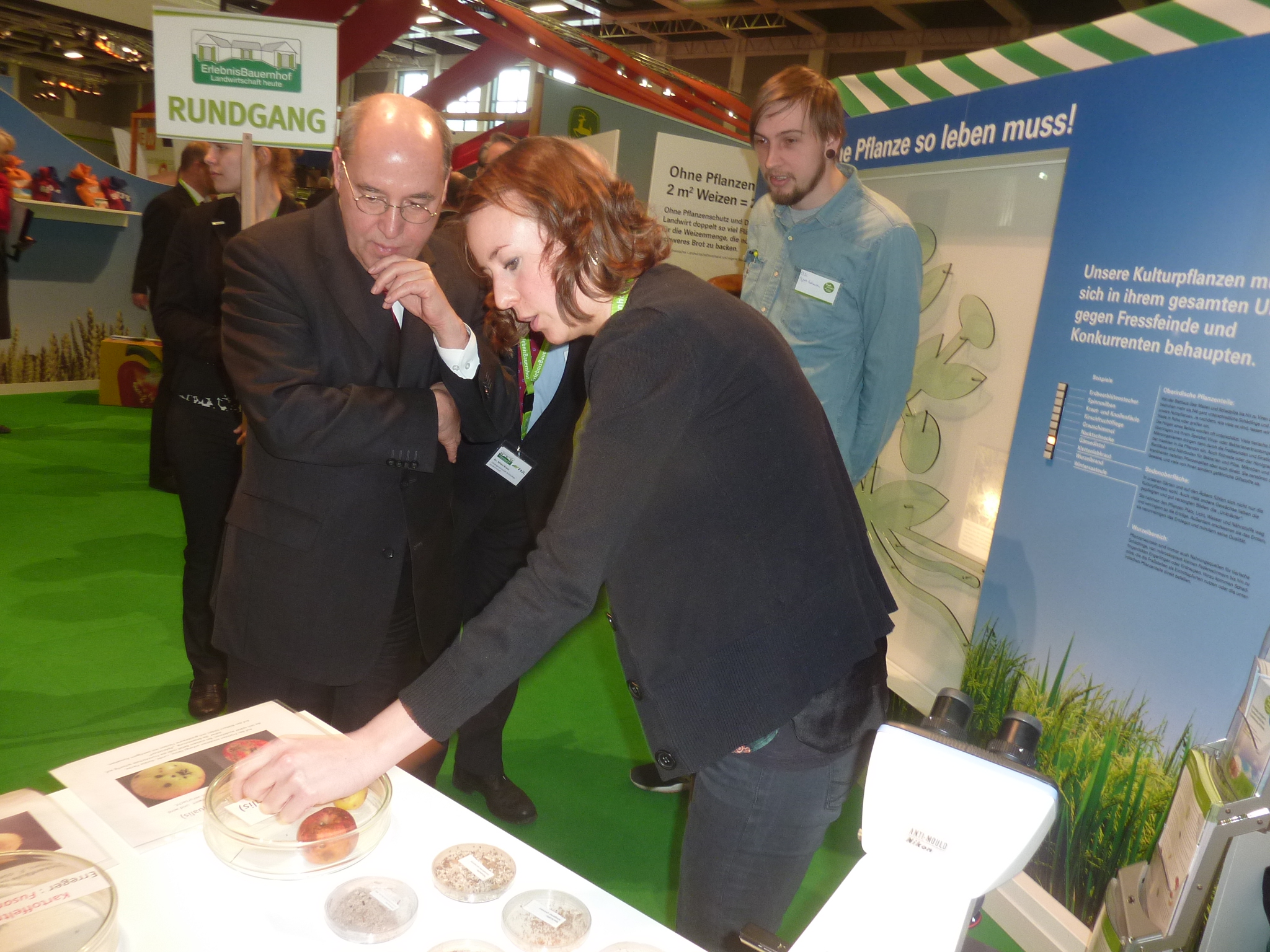 Sympathische und kompetente Begleitung erfuhren nicht nur Schulklassen, die den Treffpunkt Pflanzenschutz & Pflanzenernährung besuchten. Interessierte Verbraucher, Fachbesucher und Politiker wurden über den Stand geführt und ihnen die Exponate erläutert. In vielen Gesprächen zeigte sich das Interesse am Dialog zu den Themen des Auftritts.