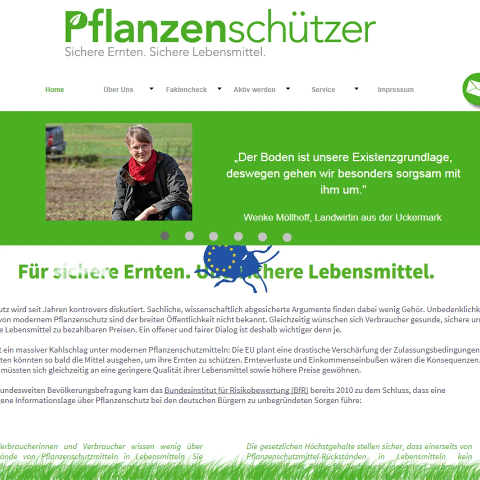 Parallel zu der Präsentation auf der Grünen Woche wurde die Internetseite www.die-pflanzenschützer.de freigeschaltet. Die blog-artig gestaltete Seite informiert über den Nutzen modernen Pflanzenschutzes, die Leistungen der deutschen Landwirtschaft und gibt einen Überblick über die Herausforderungen durch immer strengere EU-Regeln bei der Wirkstoff-Zulassung. Jeder Besucher, besonders Landwirte, an die sich die Seite in erster Linie richtet, können sich online als Unterstützer der Initiative eintragen; zu den ersten, die von der Möglichkeit Gebrauch machten, zählen übrigens Besucher der Grünen Woche.