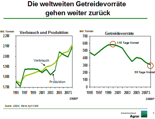 „Die Zuspitzung der Welternährungssituation zeichnet sich schon seit längerem ab. In den letzten acht Jahren war in nur einem Jahr die Getreideproduktion höher als der Verbrauch. Mittlerweile haben die Lagerbestände den tiefsten Stand seit 25 Jahren erreicht“, erklärte Hermann Kuhlmann von der YARA GmbH & Co. KG und Vorsitzender des Fachbereichs Pflanzenernährung im Industrieverband Agrar e. V. (IVA), vor der Presse in Frankfurt. Die steigenden Preise bieten einen Anreiz zur Erhöhung der landwirtschaftlichen Produktion – und zu einer höheren Nachfrage nach Düngemitteln.