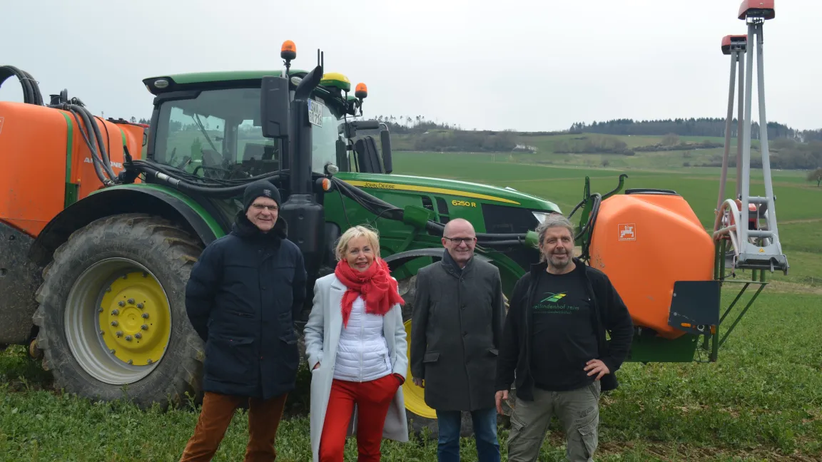 Hessens Digitalministerin Sinemus besucht Zweilindenhof in Hohenstein (v.r.n.l. T. Reim, H.-G. Paulus, Prof. Dr. K. Sinemus, F. Gemmer). Foto: IVA