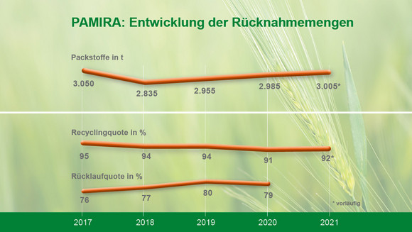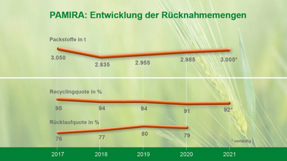 2021 wurden 3005 Tonnen (2020: 2985 Tonnen) Pflanzenschutz- und Flüssigdünger-Verpackungen über das PAMIRA-System gebührenfrei zurückgenommen und umweltgerecht entsorgt.