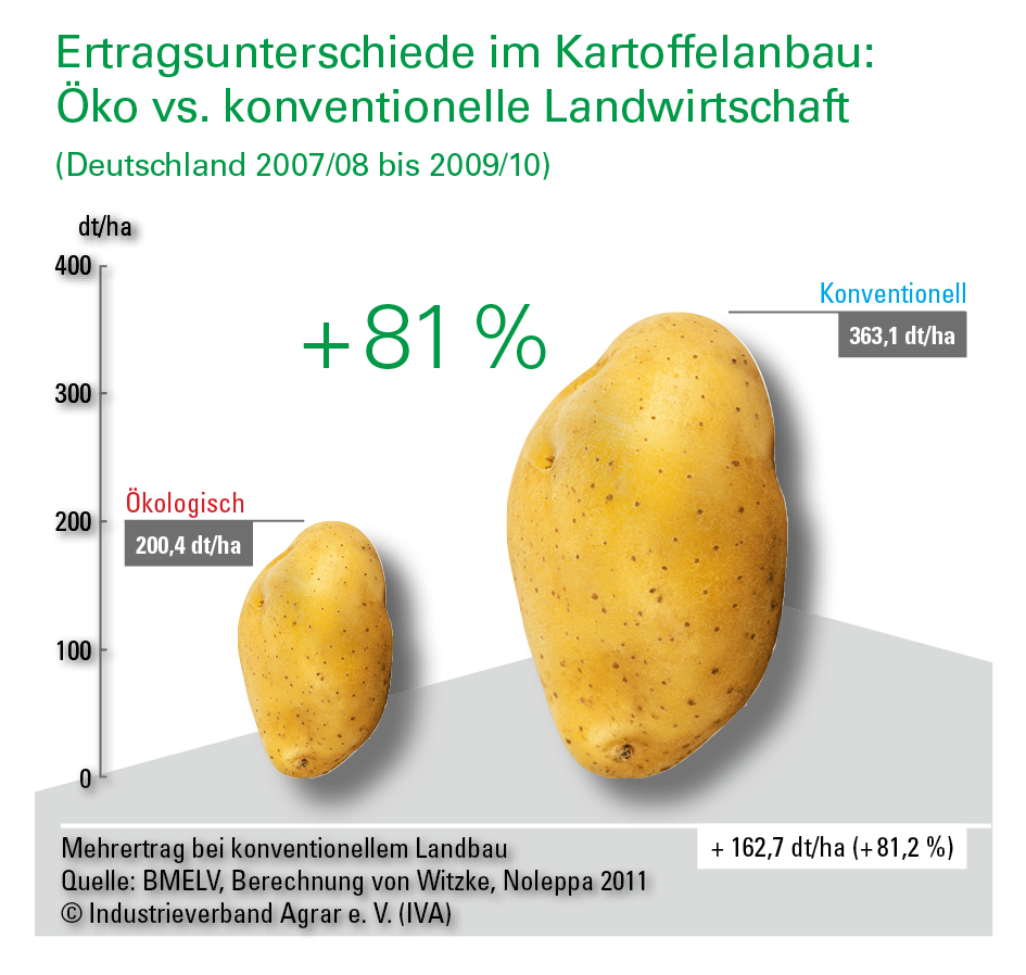 Die Auswertung belegt bei allen wichtigen Kulturpflanzen beträchtliche Ertragsunterschiede. Während der konventionell wirtschaftende Betrieb zum Beispiel bei Raps etwa 50 Prozent mehr Flächenertrag als Ökobetriebe erwirtschaftet, ist das Bild bei Getreide noch deutlicher: 120 Prozent mehr Weizen holt ein Landwirt mit dem Einsatz moderner Pflanzenschutzmittel vom Acker als ein vergleichbarer Ökobetrieb.